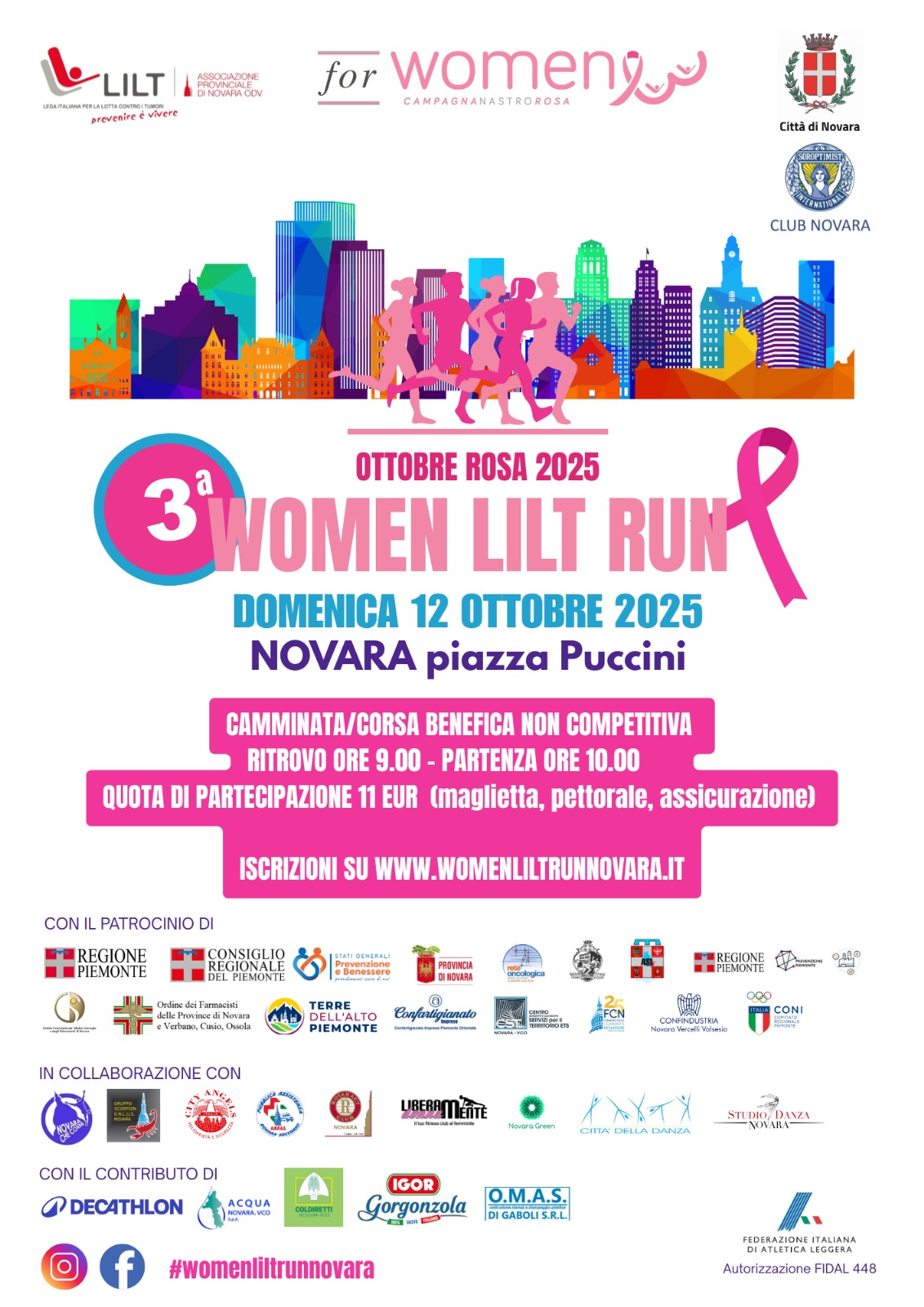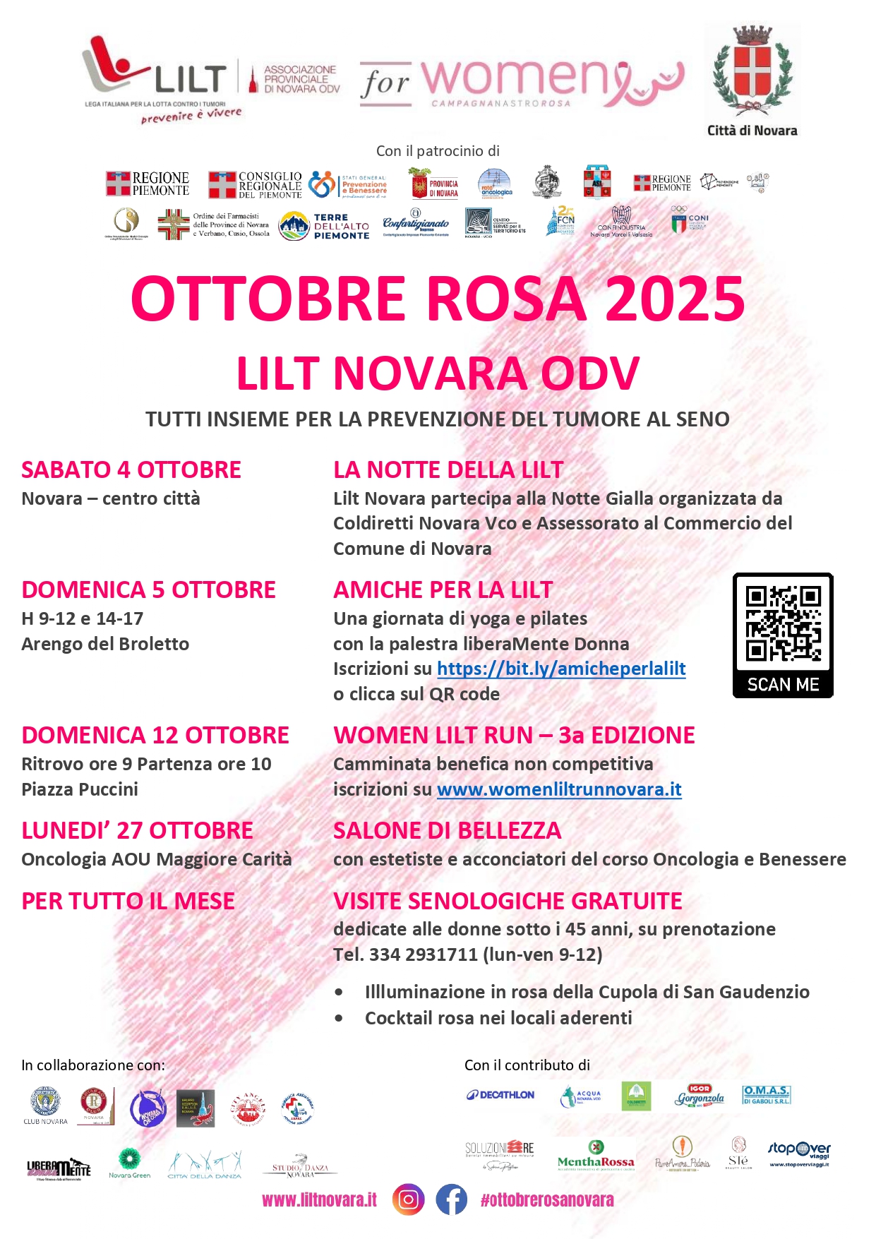 La Campagna Lilt for Women a Novara, con tutte le iniziative incluse nell’Ottobre Rosa, è realizzata in collaborazione con il Comune di Novara e con il patrocinio di Regione Piemonte, Consiglio regionale del Piemonte, Provincia di Novara, Rete Oncologica Piemonte Valle D’Aosta, AOU Maggiore della Carità di Novara, ASL Novara, Rete WHP Asl Novara, Ordine provinciale dei Medici Chirurghi e Odontoiatri di Novara, Ordine dei Farmacisti di Novara e Vco, ATL Terre dell’Alto Piemonte, Confartigianato Imprese Piemonte Orientale, CST Novara VCO, Fondazione Comunità Novarese, Confindustria Novara Vercelli Valsesia e CONI Comitato Regionale Piemonte