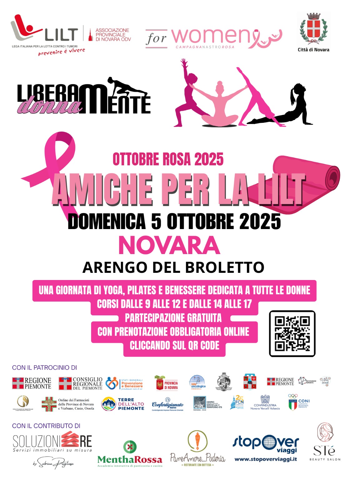 Amiche per la LILT: Domenica 5 ottobre l’Arengo del Broletto sarà allestito con 60 tappetini rosa per un’intera giornata di yoga, pilates e benessere dedicata a tutte le donne, ideata e organizzata con la collaborazione della palestra liberaMente Donna. Le lezioni si svolgeranno dalle 9 alle 12 e dalle 14 alle 17 e la partecipazione è gratuita. L’iniziativa, realizzata in collaborazione con la Città di Novara, è resa possibile grazie a Soluzioni Re Servizi Immobiliari come sponsor principale e al contributo di MenthaRossa, Pane Amore Poderia, Stopover Viaggi e STé Beauty Salon. Iscrizioni online a questo link: http://bit.ly/amicheperlalilt