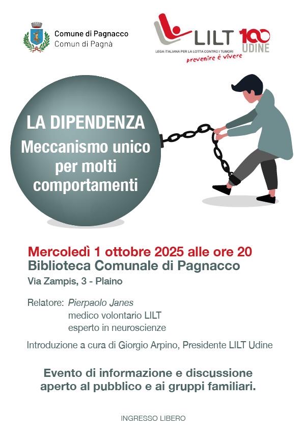 Mercoledì 1 ottobre alle ore 20:00, presso la biblioteca comunale di Pagnacco, il dott. Pierpaolo Janes, medico volontario LILT ed esperto in neuroscienze, ha parlato di "La dipendenza - Meccanismo unico per molti comportamenti".