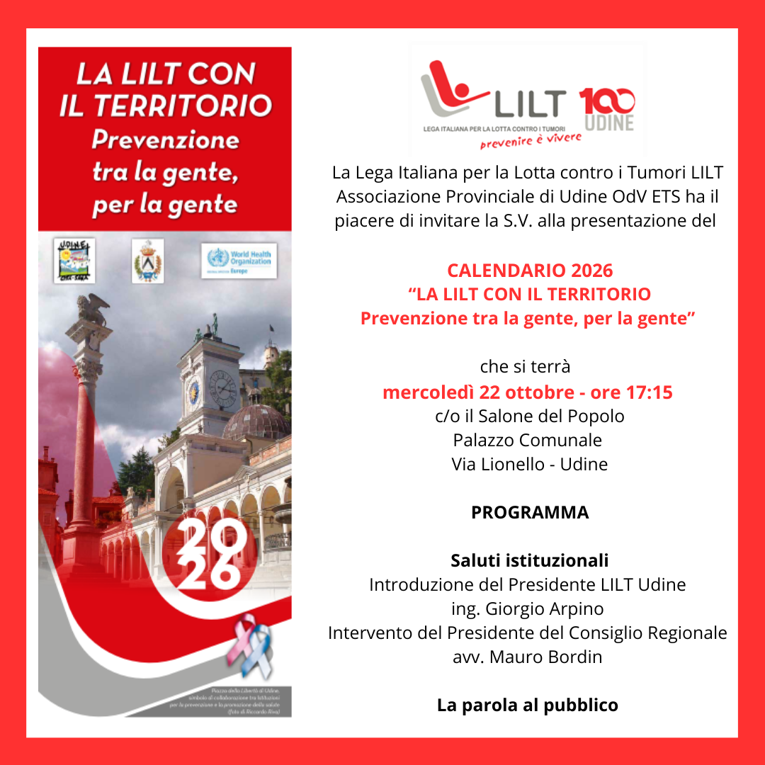 Presentato il 22 ottobre alle ore 17:15, presso il Salone del Popolo del Palazzo Comunale di Udine, il Calendario LILT 2026 "LA LILT CON IL TERRITORIO - Prevenzione tra la gente, per la gente".