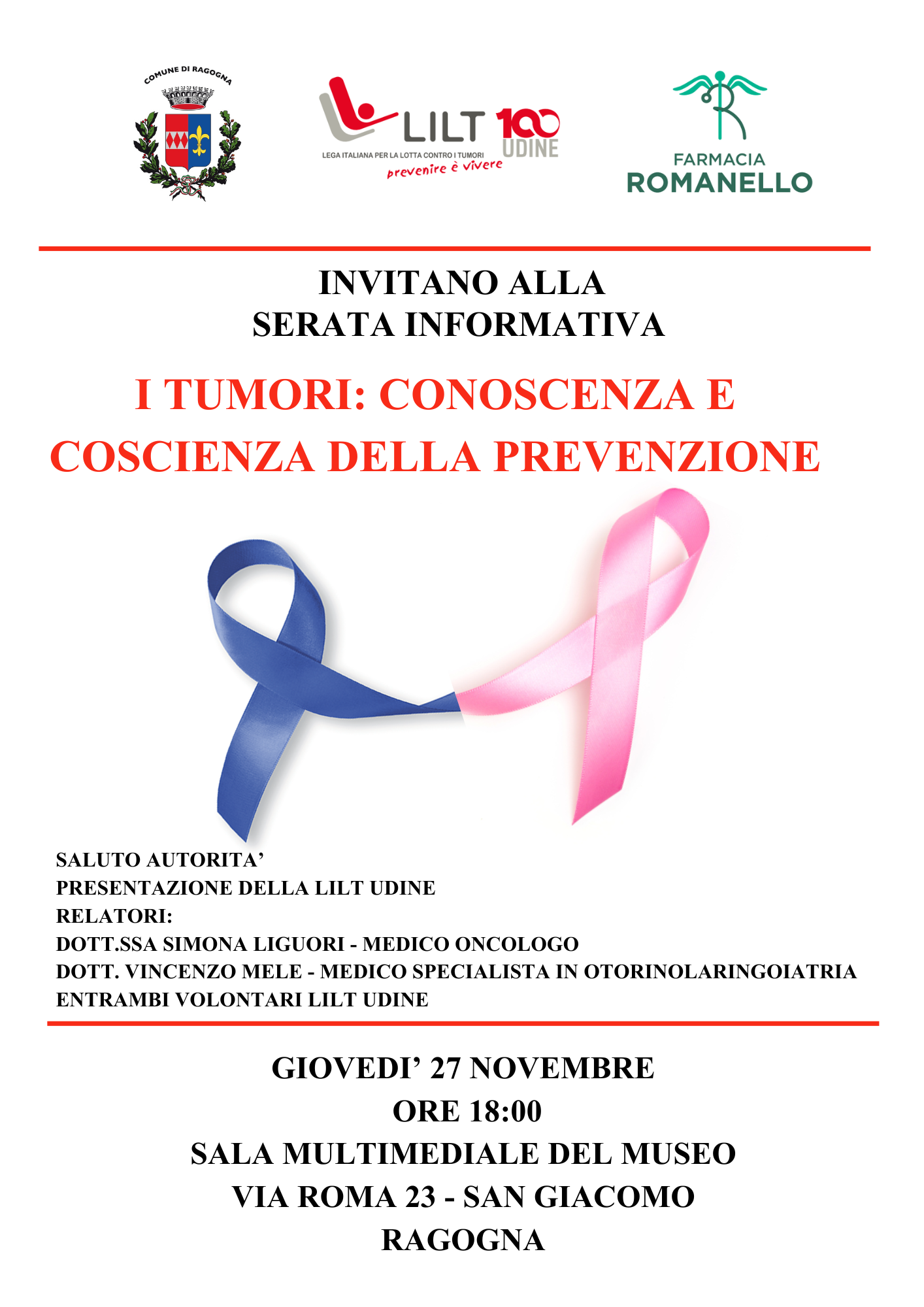 Giovedì 27 novembre, alle ore 18:00, la Sala multimediale del museo a San Giacomo di Ragogna ospiterà la dott.ssa Simona Liguori, medico oncologo, ed il dott. Vincenzo Mele, medico specialista in otorinolaringoiatria, entrambi volontari LILT Udine, che parleranno di prevenzione con la conferenze dal titolo: "I tumori: conoscenza e coscienza della prevenzione".