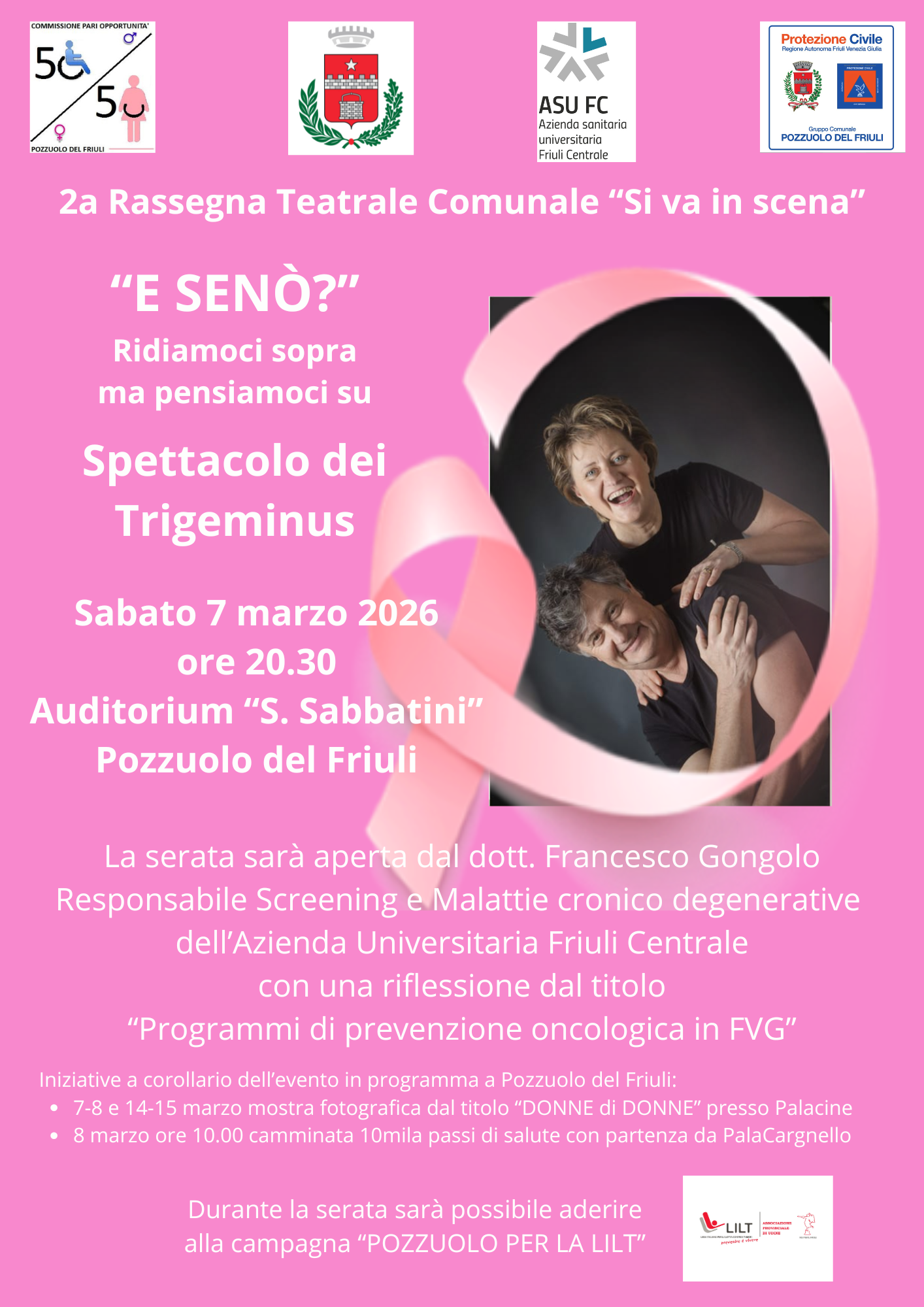 Sabato presso il Teatro comunale: serata "E senò? Spettacolo dei Trigeminus aperta dal dott. Francesco Gongolo responsabile Screening e Malattie cronico degenerative dell'ASUFC con una riflessione dal titolo " Progammi di prevenzione oncologica in FVG"