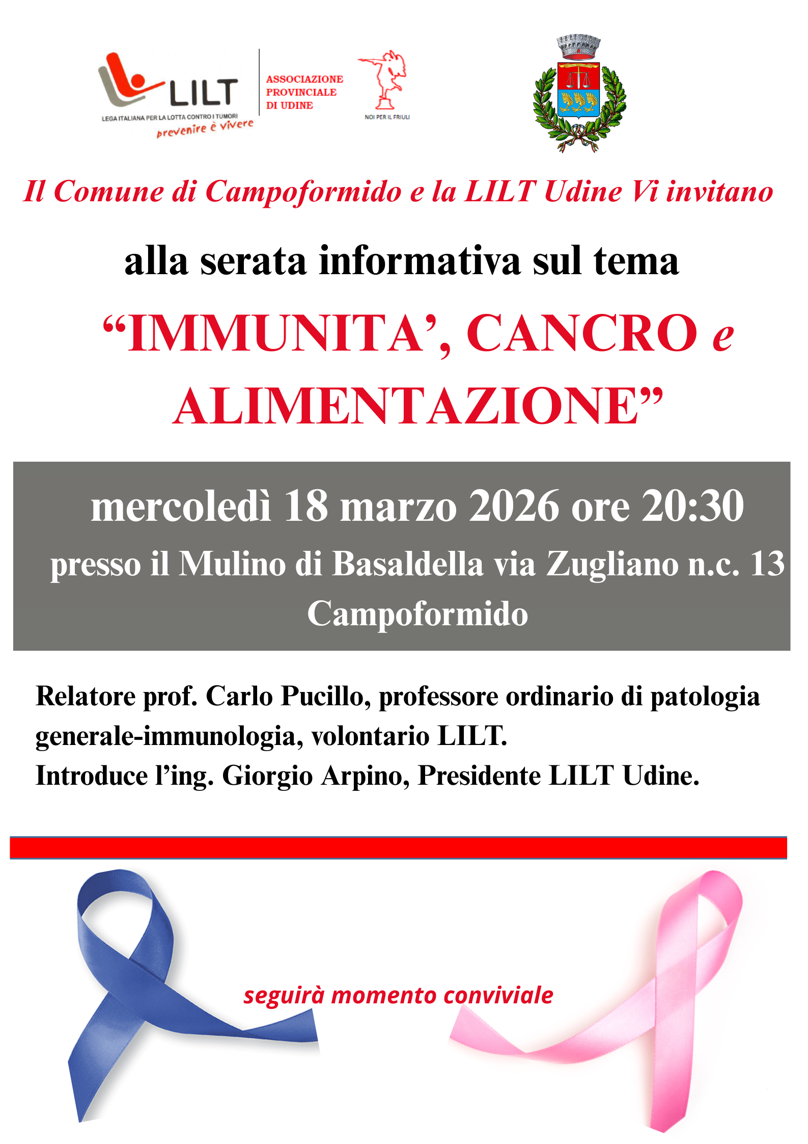 Il relatore, prof. Carlo Pucillo, professore ordinario di patologia generale-immunologia, volontario LILT Udine, parlerà di "Immunità, cancro e alimentazione".